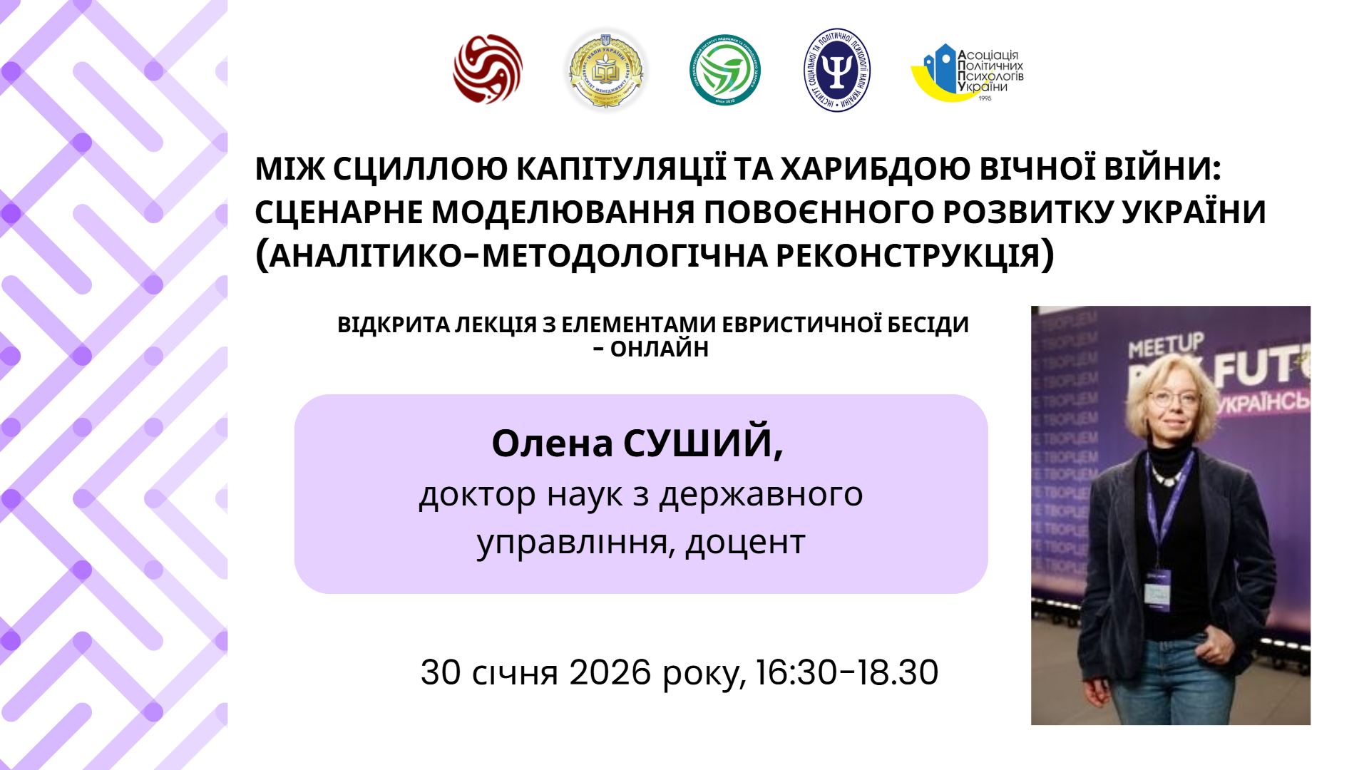 30 січня 2026 р. о 16:30-18.30 на відкриту лекцію з елементами евристичної бесіди на тему: “Між Сциллою капітуляції та Харибдою вічної війни: сценарне моделювання повоєнного розвитку України (аналітико-методологічна реконструкція”.